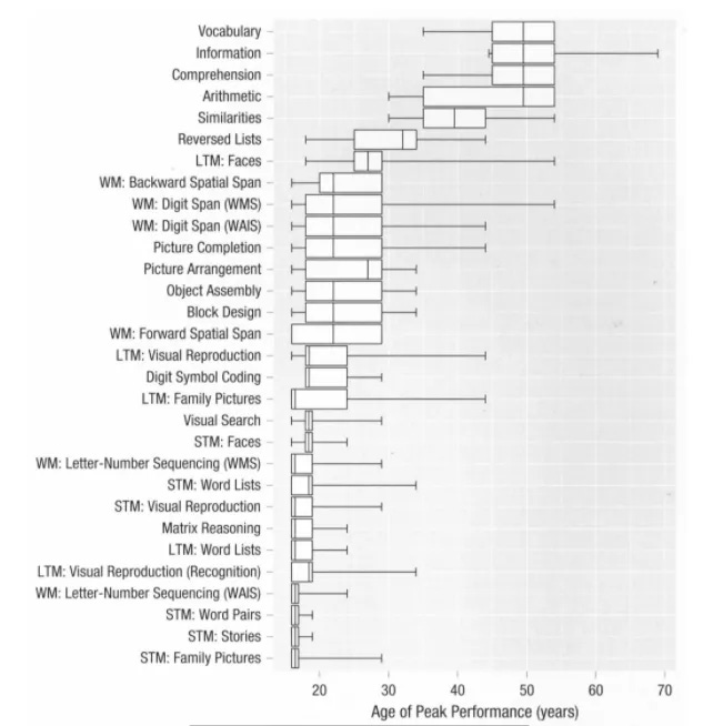 We can see why “older” cohorts may be ripe for greater granting in knowledge work when we see the spreads of peak performance by age across different domains: