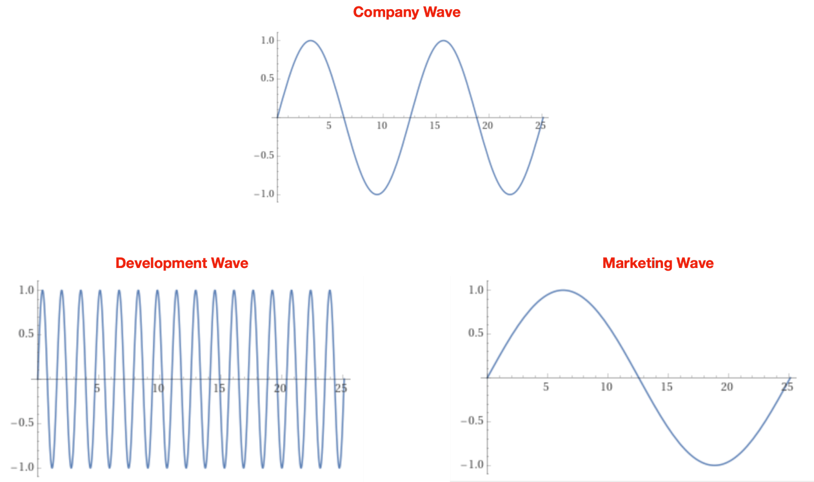 In a single product, early-stage startup, there is necessarily only one wave, and it is the company wave. As the company grows, and as the org chart becomes increasingly complex, different subsets of employees will necessarily focus on different things, and within each of these different areas (not necessarily functional areas, though this is the easiest to consider) will start to emerge their own waves. These waves might look quite different between teams!