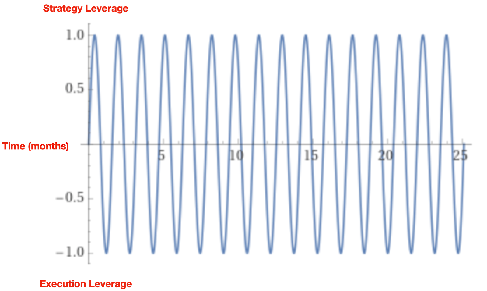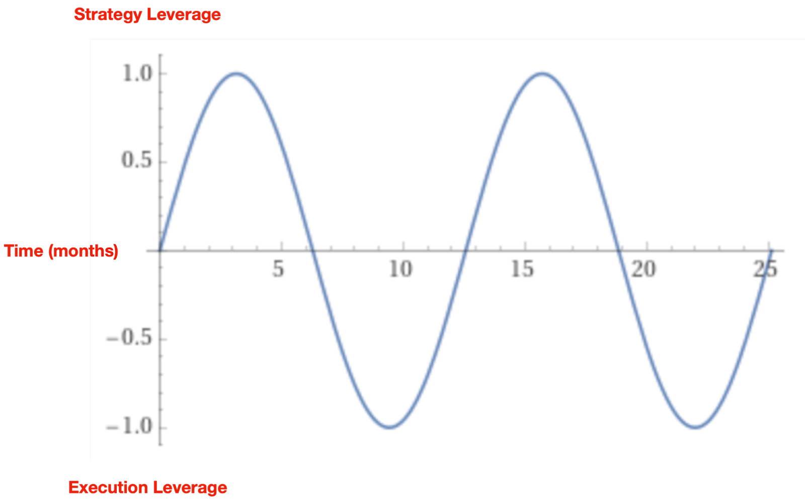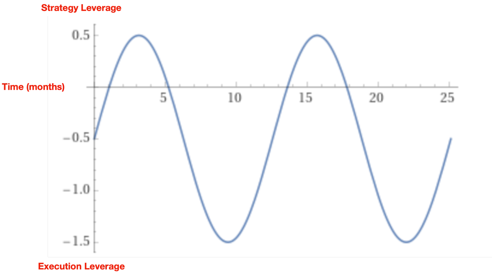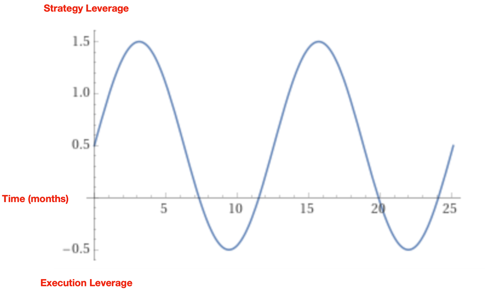 The y-axis represents the relative leverage offered by strategic versus execution decisions at any given period of time, with 0 representing effectively a perfect balance between strategy and execution.